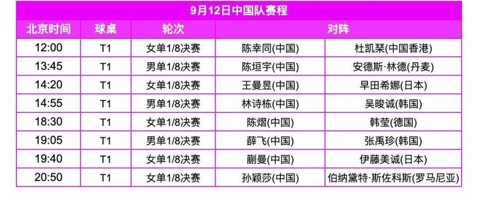 9月12日18:30,WTT澳门冠军赛女单1/8决赛,陈熠VS德国韩莹,央视CCTV5直播。