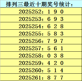 上期转头:摆设三第2025261期开奖号码为877,历史上组选出现24次,直选出现10次。