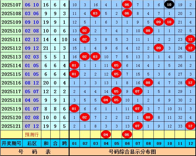 后分离析:后区上期开出号码07和12,分别遗漏1期和4期,当今后区01-12区间冷温热号码个数比为3:2:7,本期后区注视号码04+06。