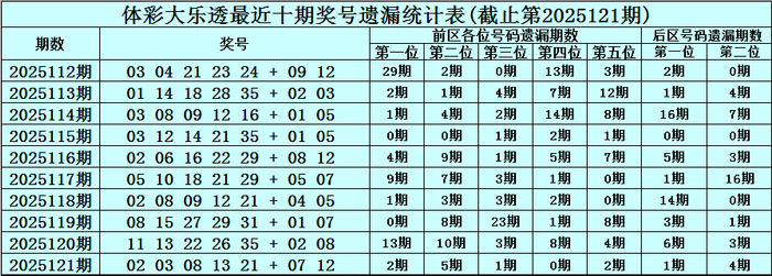 第2025121期奖号:02 03 08 13 21 + 07 12 ,诸君号码遗漏期数为:2期、5期、1期、0期、2期 + 1期、4期。
