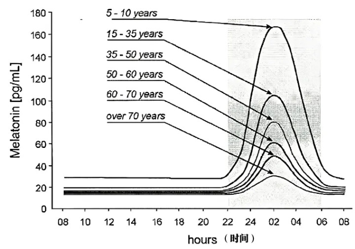 东说念主在不同庚龄,褪黑素的分泌量有很大互异:一般在芳华期前,其分泌水平达到峰值;40岁后,分泌量随年龄增长渐渐下落;70岁时减至顶峰的1/4。